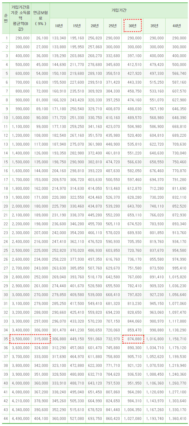 이 표를 통해 기여 기간에 따른 수령액을 쉽게 비교할 수 있습니다.