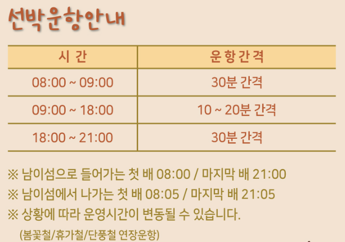 남이섬에 가기 위해서는 유람선을 이용해야 합니다. 유람선의 운항 시간은 다음과 같습니다: