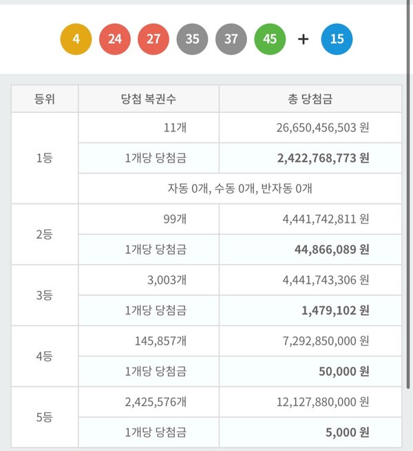 이 표는 최근 로또 결과를 보여주며, 1등 당첨자 수와 상금 분배를 한눈에 볼 수 있게 해줍니다. 예를 들어, 최근 1등 당첨자는 11명으로, 총 상금은 26억 원이 넘는다는 사실이죠.