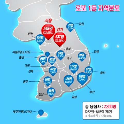 이 지도는 각 지역별 1등 당첨자 수를 나타내고 있으며, 서울과 경기도가 두드러진 수치를 보이고 있습니다. 부산, 대전, 제주 등 다른 지역에서도 당첨자가 나오고 있지만, 서울과 경기도의 비율이 압도적이죠.