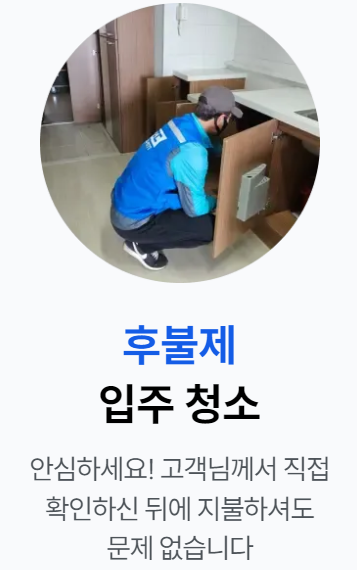 아정당의 입주청소는 후불제로 운영됩니다. 즉, 고객님이 청소 완료 후 직접 확인하신 뒤에 비용을 지불하실 수 있습니다. 이는 청소 품질에 대한 고객의 신뢰를 높이는 큰 장점입니다. 만약 청소 결과가 만족스럽지 않다면, 추가 비용 없이 재청소를 요청할 수 있습니다. 이러한 시스템은 고객이 더욱 안심하고 서비스를 이용할 수 있게 해줍니다.