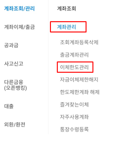2. 이체한도 관리 메뉴 접근