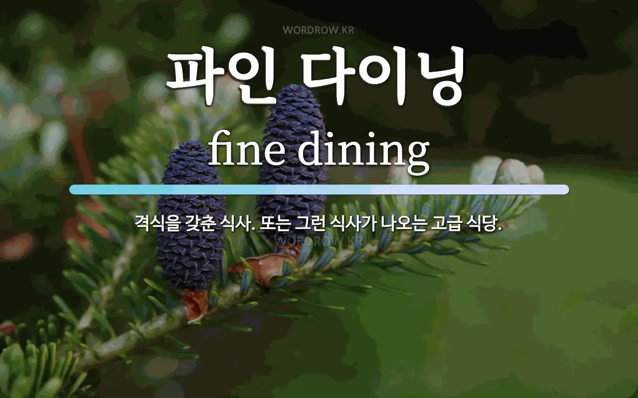 파인다이닝(fine dining)은 '고급 식사'를 의미합니다. 'fine'은 '좋은', '질이 높은'이라는 뜻을 가지고 있으며, 'dining'은 '정찬'을 뜻합니다. 즉, 파인다이닝은 고급스러운 분위기에서 제공되는 질 높은 음식을 의미합니다. 이러한 식사는 일반적으로 코스 요리 형태로 제공되며, 셰프가 직접 제철 재료를 활용하여 창의적으로 개발한 요리로 구성됩니다.